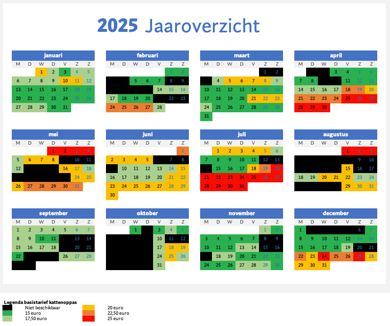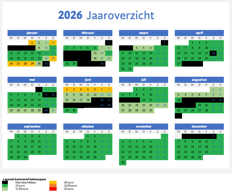 In de jaarplanner onder het tarievenoverzicht kun je de actuele situatie voor 2025 en 2026 zien. Let op, dit verandert bij iedere nieuwe boeking!